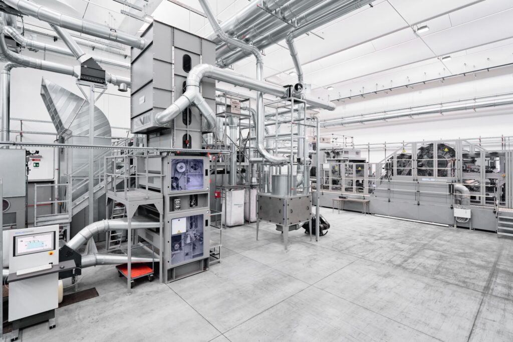 Consisting of a DiloTemafa fibre blending and filtration system, DiloSpinnbau card feeding, state-of-the-art carding, DiloMachines high speed crosslapping, and needling 6 m wide, including inline DI-LOOP for high-speed structuring.