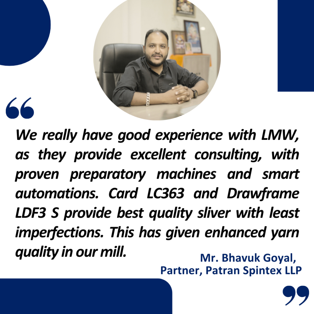 LMW’s Smart Preparatory Machines, which ensure consistent sliver quality, smooth material flow, and stable machine performance. By achieving repeatable quality parameters from day one, Patran Spintex has positioned itself as a reliable OE yarn supplier—demonstrating how smart technology and the right process foundation can translate into measurable market-ready performance.