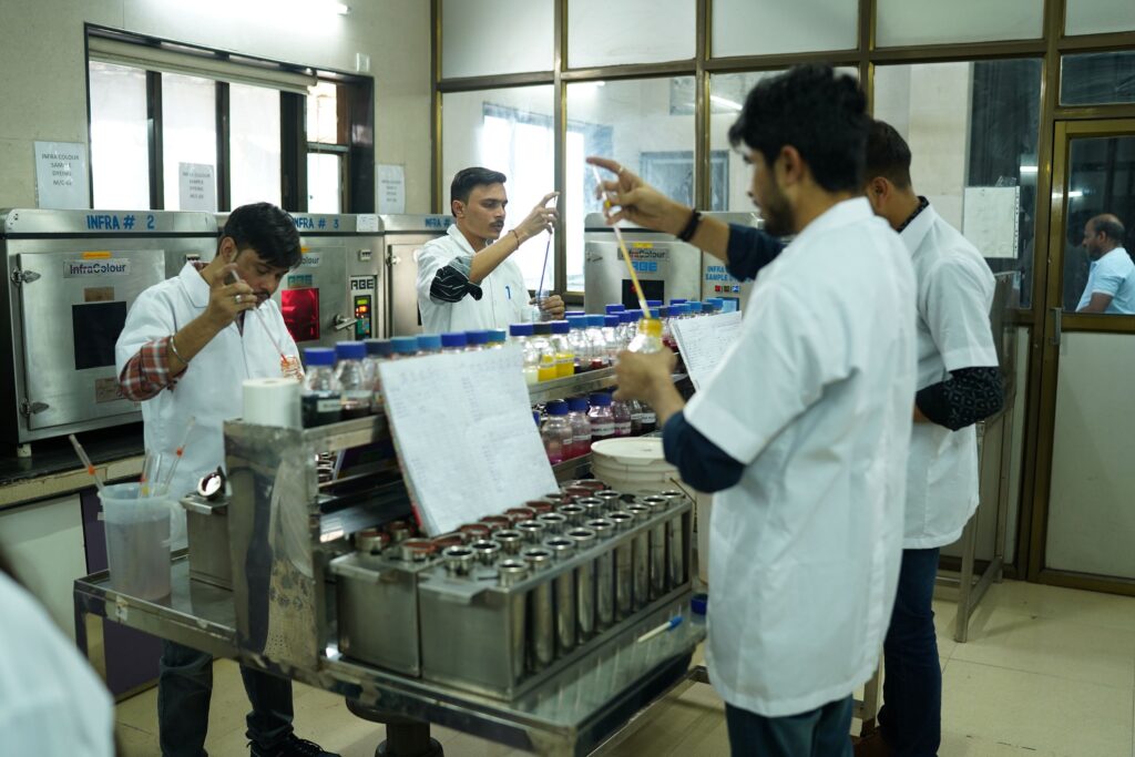 In order to supply the very best quality of yarns, Wampum Syntex also maintains strict quality control beginning from the raw material stage and at every stage of the production process. In the pre-dyeing stage, it does both visual as well as testing with instruments in their state of the art quality control laboratory, where yarns are checked for deniers, tenacity, elongation, oil percentage, etc. After the yarn is dyed, the yarns are again checked for colour shades, washing fastness, sublimation, etc and are additionally tested for other parameters as per any specific requirement from the customer.