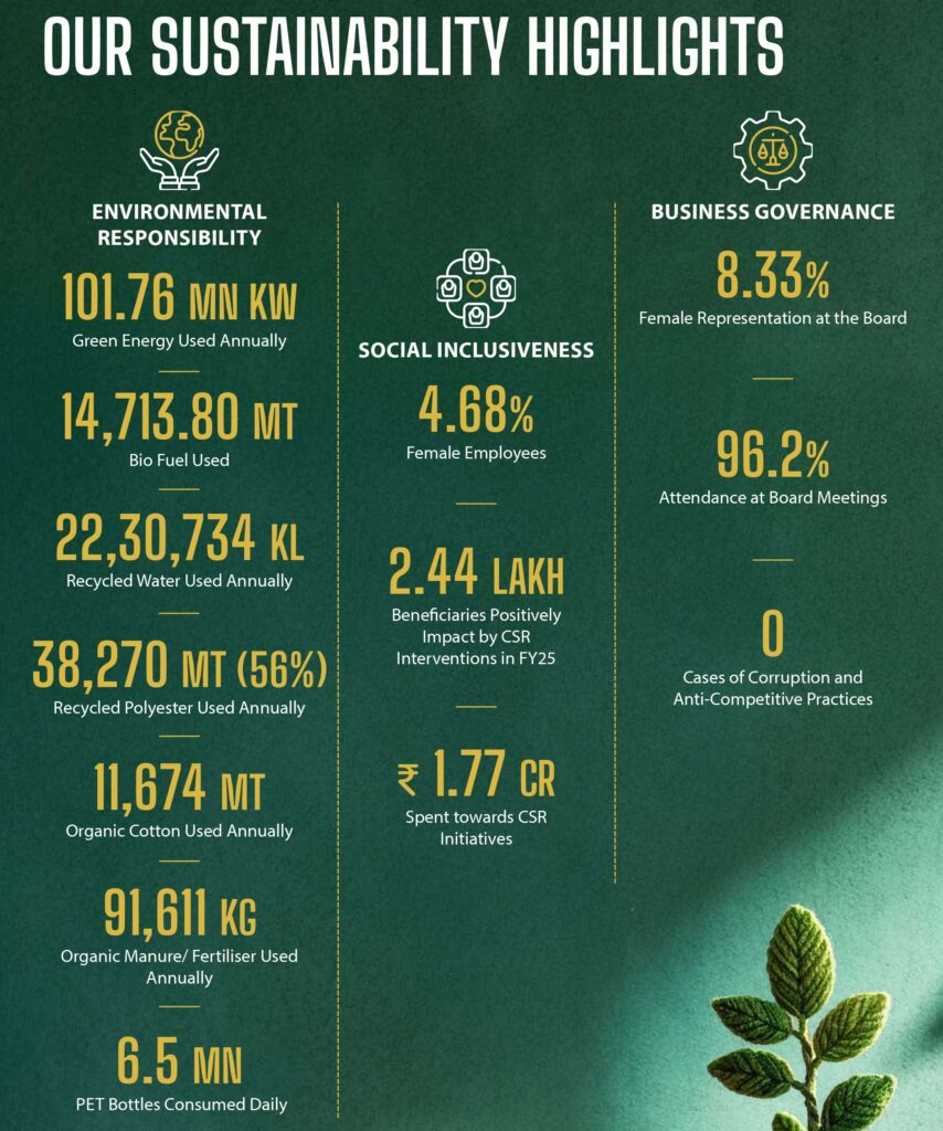 RSWM continues to set industry benchmarks in responsible energy transition, by replacing coal with husk-based boilers consuming a total 14,714 MT of biofuels. The aim is to make all boilers in manufacturing facilities operational on biofuels which will be another key endeavor to reduce company’s fossil fuel dependency. Some of the other key sustainability efforts include company’s bold pursuit of circularity which is responsible for turning waste into value. Around 6.5 million PET bottles are recycled daily leading to 43,250 MT PET bottles have been recycled in the year FY 2024-25.
